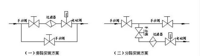 11、電磁閥的安裝位置應(yīng)預(yù)留一定操作空間,以便于日常保養(yǎng)和定期維護(hù)。 12、在管道鋼性不足或有水錘現(xiàn)象的情況下,建議把閥前后管子用支架或其它方式固定,以防電磁閥工作時引起振動。 13、在冰凍或嚴(yán)寒場所使用時,須用隔熱材料對管道和閥體加以保溫或在管道上設(shè)置加熱器。 14、電磁閥與管道接好后,要進(jìn)行正向打壓(切勿反向打壓,否則會損壞電磁閥),檢查電磁閥及接管處是否有泄漏。 15、對于配有標(biāo)準(zhǔn)接線盒的電磁閥,應(yīng)將塑料接線盒拆下打開將出廠時測試電源線去掉后將用戶電源線連接到端子上固定,而對于導(dǎo)線或引線式的電磁閥則不能去除,直接將導(dǎo)線與用戶電源線連接。 16、與電磁閥相關(guān)的電源控制線路及設(shè)施,如繼電器、開關(guān)和接觸器等應(yīng)連接牢固、不得有松動或振動,電氣回路要接入相應(yīng)的保險線,作為電氣回路的保護(hù),否則將影響電磁閥的正常工作或損壞。 17、為便于正常維護(hù)或預(yù)防電磁閥發(fā)生故障時維修更換,并保證系統(tǒng)正常運(yùn)行,建議采取以下其中之一備用管路方案: