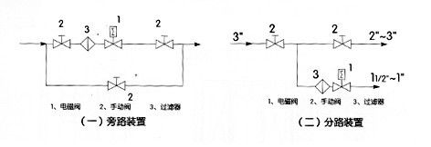 煤氣電磁閥--安裝須知 1、安裝時(shí)電磁閥線圈向上,并保持垂直位置,電磁閥上箭頭或標(biāo)記應(yīng)與管道流向一致,不得安裝在有濺水或漏水的地方。 2、電磁閥的工作介質(zhì)應(yīng)清潔無(wú)顆粒雜質(zhì),電磁閥內(nèi)件表面上的污物及過(guò)濾器,需定期清潔干凈。 3、在電磁閥發(fā)生故障時(shí),為了及時(shí)隔離電磁閥,并保證系統(tǒng)正常運(yùn)行,最好安裝旁路裝置(如圖一)。 4、在管路系統(tǒng)中,安裝在支路上的電磁閥通徑應(yīng)小于主管道閥門(mén)的通徑(如圖二)。 5、安裝電磁閥前,管道必須清洗干凈。建議在閥前安裝過(guò)濾器,蒸汽管道安裝疏水閥。 6、不能將閥安裝在管道的低凹處,以免因蒸汽冷凝水、雜質(zhì)等沉淀在閥內(nèi)而防礙動(dòng)作。 7、普通型不能在爆炸危險(xiǎn)場(chǎng)合使用。 8、在管路剛性不足情況下,建議把閥前管道用支架固定,以免電磁閥工作時(shí)引起振動(dòng)。 9、在安裝前,要注意看清產(chǎn)品標(biāo)牌,認(rèn)真閱讀使用說(shuō)明書(shū),判斷產(chǎn)品是否符合使用條件。 10、電磁閥前后管道上需安裝壓力表,以便觀察管道壓力。