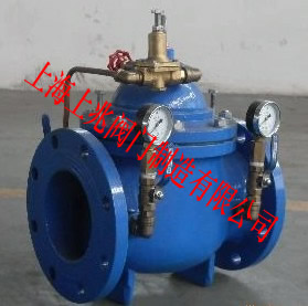 200X-16-100減壓穩(wěn)壓閥由主閥,先導(dǎo)閥,針閥,球閥,微過濾器和壓力表組成,形成液壓控制接管系統(tǒng)。使用時,當(dāng)設(shè)定出口壓力時,可以自動保持穩(wěn)定的出口壓力。本產(chǎn)品采用自支撐先導(dǎo)閥,不需要其他設(shè)備和能源,維護(hù)方便,壓力控制精度高,受入口壓力和流量影響小,減壓和電壓調(diào)節(jié)可靠。廣泛用于高層建筑,生活區(qū)等供水管網(wǎng)系統(tǒng)和城市供水工程。 當(dāng)閥門從入口端供水時,水流過針閥進(jìn)入主閥控制室,出口壓力通過導(dǎo)管流向?qū)чy。當(dāng)出口壓力高于先導(dǎo)彈簧設(shè)定值時,先導(dǎo)閥關(guān)閉??刂剖彝V古潘藭r主閥控制腔室壓力上升并關(guān)閉主閥,出口壓力不再上升。 當(dāng)閥門出口壓力下降到先導(dǎo)閥設(shè)定壓力時,先導(dǎo)閥打開,控制室向下游排放。由于先導(dǎo)閥系統(tǒng)的位移大于針閥的進(jìn)水口,因此主閥控制室中的壓力下降。入口壓力打開主閥。在穩(wěn)定狀態(tài)下,控制室有相同的排水和排水,主閥開度不變,出口壓力穩(wěn)定。可以通過調(diào)節(jié)先導(dǎo)彈簧來設(shè)定出口壓力。
