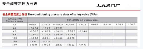 安全閥都有公稱壓力和整定壓力。公稱壓力是指閥體最大允許承受的壓力,如公稱壓力為PN16、PN25、PN40、PN64等;整定壓力是指彈簧在壓力的作用下,達到這個設定的壓力值時,彈簧即頂起閥桿向外泄壓。如整定壓力為0.1Mpa、1.2Mpa、2.2Mpa等。公稱壓力是指的安全閥的耐壓等級,也就是說安全閥最高承受的壓力。而安全閥整定壓力是指安全閥內部達到這個壓力就起跳。整定壓力是可調的,但是整定壓力也存在分級關系,一般是在標準設定的范圍內調整。見下圖安全閥整定壓力分級表: