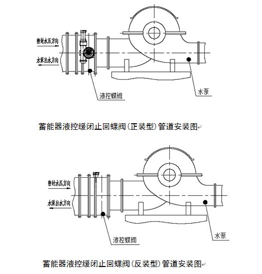 本電控設(shè)備接入DC24V備用電源。當(dāng)常規(guī)電源失電時,備用電源自動接入,保證閥門自動工作。當(dāng)水泵停機時,蝶閥才同時關(guān)閥。 6.2.5遠(yuǎn)程監(jiān)控 控制系統(tǒng)可接收遠(yuǎn)程開閥、關(guān)閥、停閥、水泵狀態(tài)信呈外,還輸出各種信號供遠(yuǎn)程DCS監(jiān)控,主要有:閥門位置信號、遠(yuǎn)程狀態(tài)信號、油泵狀態(tài)信號、電機過載、開閥超時信號、閥門位置模擬信號等,信號均為無源干接點開關(guān)量信號。 6.3手動操作 動力電源失電時,搖動手搖泵,亦可實現(xiàn)閥門開啟。 手動關(guān)閉時打開“10常閉截止閥”,關(guān)閥到位后,關(guān)閉“10常閉截止閥”;要放掉蓄能器的壓力油時,打開“09常閉截止閥”,壓力油放完后關(guān)閉;“08常開截止閥”通常狀態(tài)是打開的,如果“06電磁球閥”有故障,需要檢修,關(guān)閉“08常開截止閥”,進(jìn)行檢修,不影響閥門使用(可以液壓或手動開閥,手動關(guān)閥)。 手動功能主要是利用備用電源進(jìn)行閥門調(diào)試,或在特殊情況下的閥門緊急關(guān)閉。 1.5壓力變送器高、低壓調(diào)整 壓力變送器高、低壓的調(diào)整方法:點擊主菜單“控制面板”,點擊子菜單“油壓設(shè)定”,再點擊子菜單“上限”“下限”,彈出數(shù)字框,自行設(shè)定就行了。出廠時已設(shè)定,不要隨意更改。 七、吊裝及調(diào)試維護(hù) 7.1吊運 運輸起吊時不得翻轉(zhuǎn)、倒放,開箱后用吊車運蝶閥,起吊時注意在四個起吊點中選取平衡位置。 7.2儲存 產(chǎn)品長時間存放時,放于干燥處,閉進(jìn)出口兩端,在密封面上涂防銹油。臨時停放時可在外墻板位置增加輔助支承以保持平穩(wěn)。半年不安裝,液壓系統(tǒng)須清洗換油。 7.3安裝 安裝前應(yīng)核對本閥銘牌參數(shù)是否符合使用要求,清洗閥體通道及蝶板、檢查各部位有無有無損壞現(xiàn)象,各零件聯(lián)接螺栓是否緊固。 正反安裝分別按圖所示,確認(rèn)液壓傳動系統(tǒng)與水泵出水管道的相對方位,將閥門安裝在水泵出口。 蝶板安裝的基礎(chǔ)上應(yīng)校正水平,保證閥軸不傾斜。閥門支腳及輔助支承主要用于保證閥門安裝運行平穩(wěn),不宜大量承受與其垂直的管道軸向推力;軸向水推力應(yīng)通過閥前或閥后管道傳遞到支承基礎(chǔ)上。 注:液控止回蝶閥閥體上的方向表示閥門的承壓方向,當(dāng)安裝于水泵出口時,閥體上箭頭方向應(yīng)與水泵出水方向相反,且閥門立、臥安裝不影響效果。