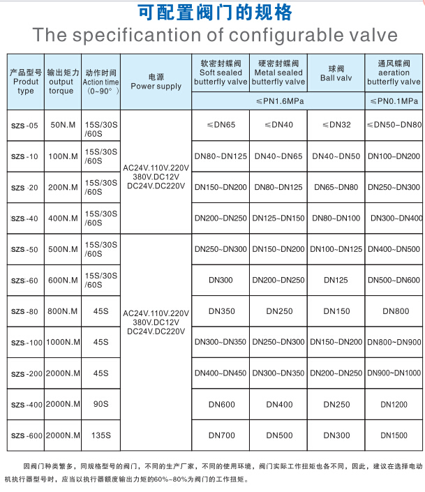 產(chǎn)品介紹 SZS精小型電動執(zhí)行器產(chǎn)品介紹: 快開電動執(zhí)行器適用于快開需求的球閥,蝶閥等電動快速 - 開關(guān)閥,快開電動球閥,快開蝶閥等。 0-90°全行程:全開,全程單向動作時間2秒(快速切換)。 適用于壓力高,壓差大,不能使用電磁閥的高開啟場合。 適配閥門:球閥、V型調(diào)節(jié)閥、蝶閥、通風閥門、風門、風機、動態(tài)平衡閥、旋塞閥等部分旋轉(zhuǎn)閥和其他工業(yè)領域的機械定位旋轉(zhuǎn)。 快開電動執(zhí)行器在1500V高壓測試后沒有漏電流,確保您的系統(tǒng)完全正常運行。 ★長壽命設計 超過50,000次開啟 - 現(xiàn)場無故障運行,您的系統(tǒng)可靠無憂! ★DDS交換機調(diào)試技術(shù) DDS交換機調(diào)試技術(shù),直接調(diào)試交換機,改變了傳統(tǒng)繁瑣的調(diào)試步驟原有工業(yè)中的電動閥和電動執(zhí)行器,直接簡化為一步操作和調(diào)試。 旋轉(zhuǎn)表盤頂部旋鈕,輕松完成電動執(zhí)行器后的電氣和機械位置校準。連接到閥門。 精致的小型設計 重量輕,適用于各種角行程閥(球閥,蝶閥,旋塞??閥等)和閥門共同構(gòu)成電動控制閥,電動球閥,電動蝶閥和其他工業(yè)自控電動閥。 本實用新型體積小,管道上各種角度安裝方便,適用于各種復雜的管道和工況。 ★良好的密封性能 執(zhí)行器密封標準 - 執(zhí)行器整體浸入水中,無氣泡泄漏。 特別適用于室外露天環(huán)境。 ★良好的可靠性 產(chǎn)品電氣元件和各種精密零件均采用進口元件,確保高品質(zhì)和可靠性。 良好的耐壓性 ZSZ精小型電動執(zhí)行器,1500V高壓測試,無泄漏,確保您的系統(tǒng)完全正常運行 ZSZ精小型電動執(zhí)行器可配閥門選型表: ![]() | ||