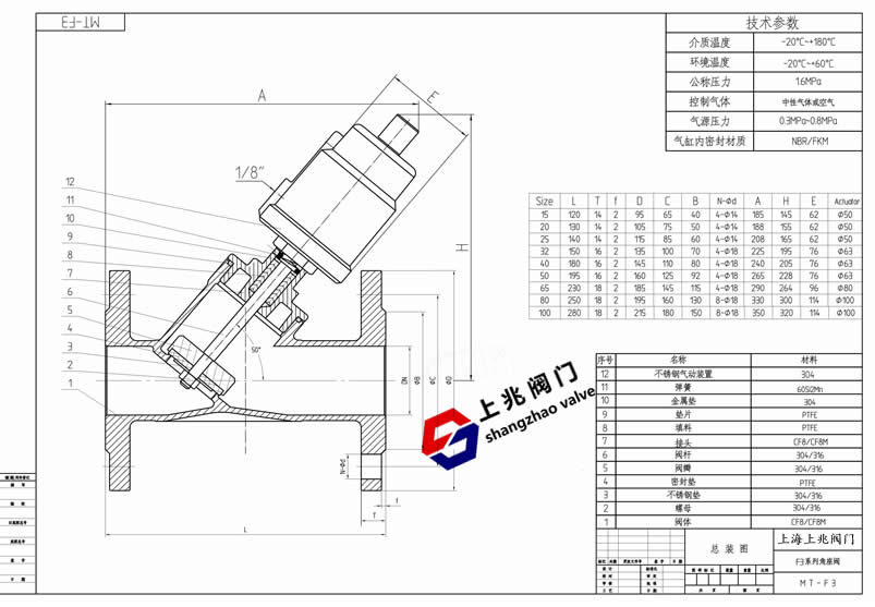 產(chǎn)品介紹 法蘭氣動角座閥(不銹鋼頭)--工作原理: 在非工作狀態(tài)時,由于彈簧力作用,閥門常閉(開)。當(dāng)執(zhí)行器活塞被壓縮氣體作用時,閥門打開(關(guān)閉)。雙作用形式靠壓縮氣體控制閥門開關(guān)。 法蘭氣動角座閥(不銹鋼頭)--應(yīng)用范圍: 啤酒飲料灌裝設(shè)備 制藥及醫(yī)療設(shè)備 印染紡織 化工行業(yè) 氣體工業(yè) 高溫滅菌 發(fā)泡機(jī)械 水/污水處理 法蘭氣動角座閥(不銹鋼頭)--特點(diǎn): 流量大,流阻小,無水錘 Y型設(shè)計(jì),增加30%流量 超長使用壽命 閥桿自動校正,自潤滑,免維護(hù) 氣缸采用不銹鋼材質(zhì),在惡劣環(huán)境中更加優(yōu)秀,可360°旋轉(zhuǎn)。 法蘭氣動角座閥(不銹鋼頭)--技術(shù)參數(shù): 管道壓力:Max1.6Mpa(232psi) 控制壓力:0.3-0.8Mpa(43.5-116psi) 控制介質(zhì):中性氣體或空氣 閥體材料:CF8M/CF8(SS316,SS304) 密封材料:聚四氟乙烯 氣缸材料:CF8(SS304) 氣缸尺寸:27mm,32mm,40mm,50mm,63mm, 80mm,100mm,125mm 適用介質(zhì):水,酒精,油,染料,蒸汽,中性氣體或液體,有機(jī)溶劑,酸堿溶液 介質(zhì)溫度:-10℃-+180℃,25℃-+220℃ 環(huán)境溫度:-10℃-+80℃ 控制形式:單作用常閉,常開,雙作用常閉,雙作用自由態(tài) 連接形式:螺紋式,焊接式,法蘭式,快裝式