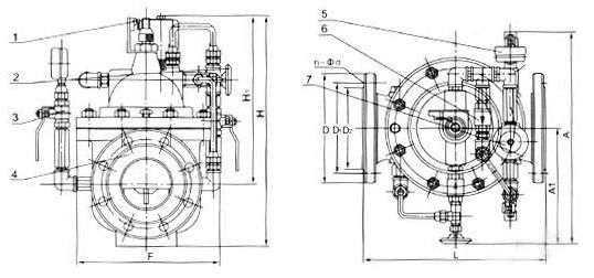 當(dāng)水泵停止工作時(shí),電磁導(dǎo)閥先關(guān)閉,主閥控制室停止排水,控制室壓力升高,主閥開始關(guān)閉。當(dāng)關(guān)閉至90%時(shí),主閥上部行程開關(guān)輸出停泵信號(hào),水泵停止運(yùn)轉(zhuǎn)。此時(shí)下游回水經(jīng)單向閥進(jìn)入主閥控制室,控制室壓力升高,主閥被關(guān)閉 三、700X多功能水泵控制閥--主要技術(shù)參數(shù)