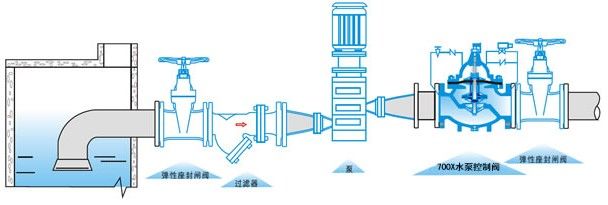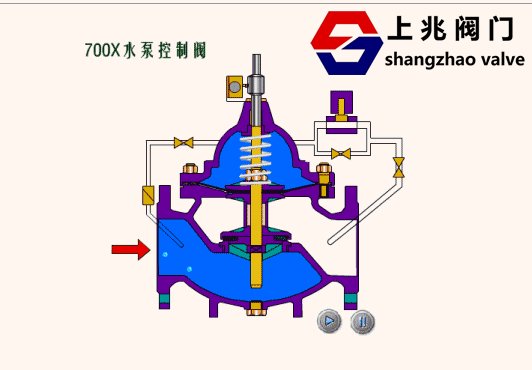 700X多功能水泵控制閥由主閥、電磁導(dǎo)閥、針閥、球閥、單向閥、行程開關(guān)、微形過濾器和壓力表組成水力控制接管系統(tǒng)。水泵需停止工作時(shí),先由進(jìn)口壓使主閥關(guān)閉90%后,水泵停止運(yùn)轉(zhuǎn)。剩余10%由回水關(guān)閉??煞乐顾N現(xiàn)象發(fā)生。本產(chǎn)品利用電磁導(dǎo)閥控制,不需要其它裝置和能源。節(jié)約能源,保養(yǎng)簡(jiǎn)便,停泵平穩(wěn)。電磁閥可采用交流電220V或直流電24V。 二、700X多功能水泵控制閥--工作原理
