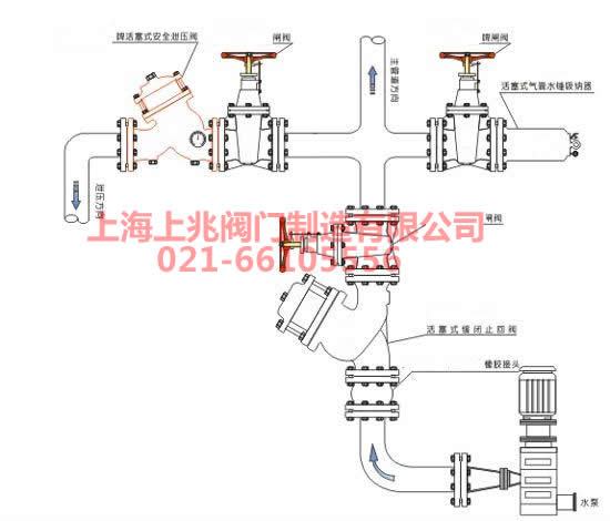 六、YQ98002型過濾活塞式安全泄壓閥--安裝方式及連接要求: 一、根據工況的減壓特性,必須在該閥前安裝 閘閥; 二、方便日后對該閥進行檢修工作.必須在減壓閥后安裝可曲繞軟連接; 三‘最佳安裝方式為臥式,其它方位也可以接受; 四、必須留出足夠的工作空間方便檢修; 五、吊裝時采用有效措施進行.也可利用該閥吊環(huán)進行。 七、YQ98002型過濾活塞式安全泄壓閥--安裝圖: