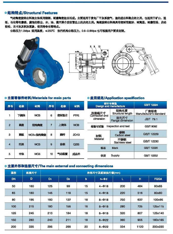 產(chǎn)品介紹 氣動(dòng)陶瓷旋轉(zhuǎn)閥--產(chǎn)品概述: SZBZ643TC 氣動(dòng)陶瓷旋轉(zhuǎn)閥主要適用于火電廠干灰系統(tǒng)灰、渣出料的啟閉之用,也適用于礦山、石灰廠、水泥廠等有磨損、腐蝕的粉塵介質(zhì)的進(jìn)料啟閉。本閥門具有密封性能好,耐高溫,耐磨性強(qiáng),啟閉靈活,無卡灰及積灰現(xiàn)象,使用壽命長等特點(diǎn)。 SZBZ643TC 氣動(dòng)陶瓷旋轉(zhuǎn)閥產(chǎn)品主體采用鑄鋼、耐磨陶瓷組合而成。 使用溫度≤250℃ 執(zhí)行機(jī)構(gòu)公稱壓力為0.4Mpa-0.6 Mpa閥門公稱壓力為1Mpa. 也可根據(jù)用戶要求定制。 氣動(dòng)陶瓷旋轉(zhuǎn)閥特點(diǎn)說明: 氣動(dòng)陶瓷旋轉(zhuǎn)閥用于電廠干灰系統(tǒng)倉泵進(jìn)料閥,可用于高硬度的顆粒介質(zhì),也可用于礦山、造紙、化工等各類有磨損的干粉塵、水蒸氣的管道上作啟閉之用.公稱壓力1.0Mpa,適應(yīng)溫≤150℃密封面采用硬密封與介質(zhì)接觸的部分均為結(jié)構(gòu)陶瓷材料,其化學(xué)穩(wěn)定性及硬度極高,使用壽命是普通材料閥門的510倍.因?yàn)榫哂袠O高的耐磨損、耐腐蝕、耐沖蝕性能,且隔熱性好、熱膨脹小,所以本閥為用戶帶來極高的經(jīng)濟(jì)利益. 本閥料口全流通無阻擋物,有壓縮空氣自動(dòng)吹堵裝置,卡灰、積灰現(xiàn)象少. 本閥采用高檔曾韌結(jié)構(gòu)陶瓷密封,機(jī)械強(qiáng)度高耐磨性能好使用壽命長.結(jié)構(gòu)緊湊可任意角度安裝。 ![]() | ||