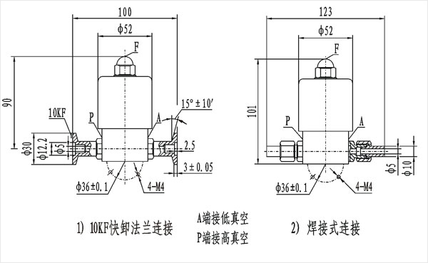 電磁高真空帶充氣閥連接在高低真空系統(tǒng)上,該閥通電閥板打開,同時(shí)封閉充氣口,將P、A端管路接通;斷電時(shí)閥板關(guān)閉,切斷P、A端管路,保證系統(tǒng)的真空度,同時(shí)打開充氣口,通過F端向A端充氣。
